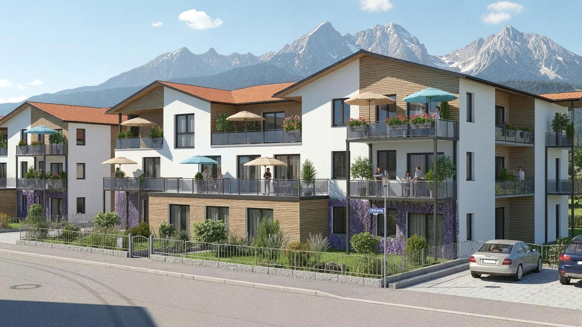 Tiefgaragenstellplätze sind zu einem Kaufpreis von 30.000 Euro und Außenstellplätze zu 12.000 Euro verfügbar.